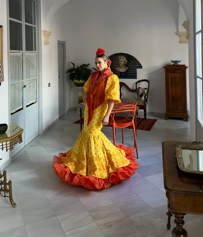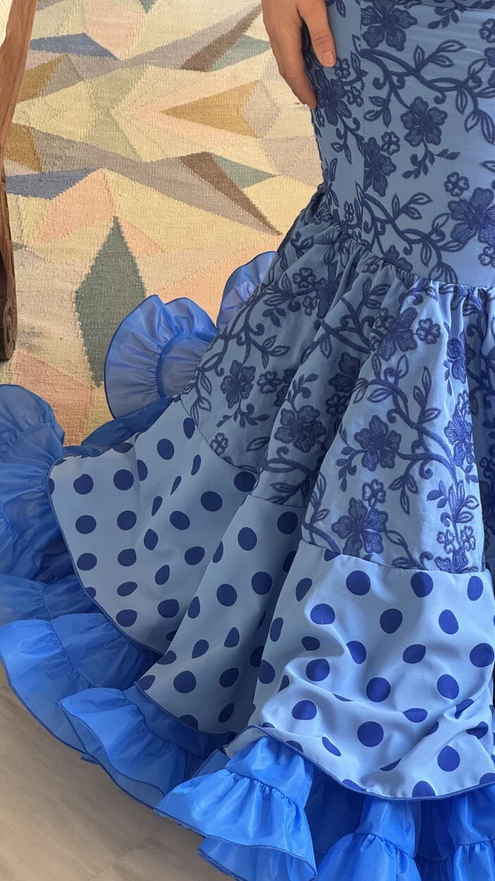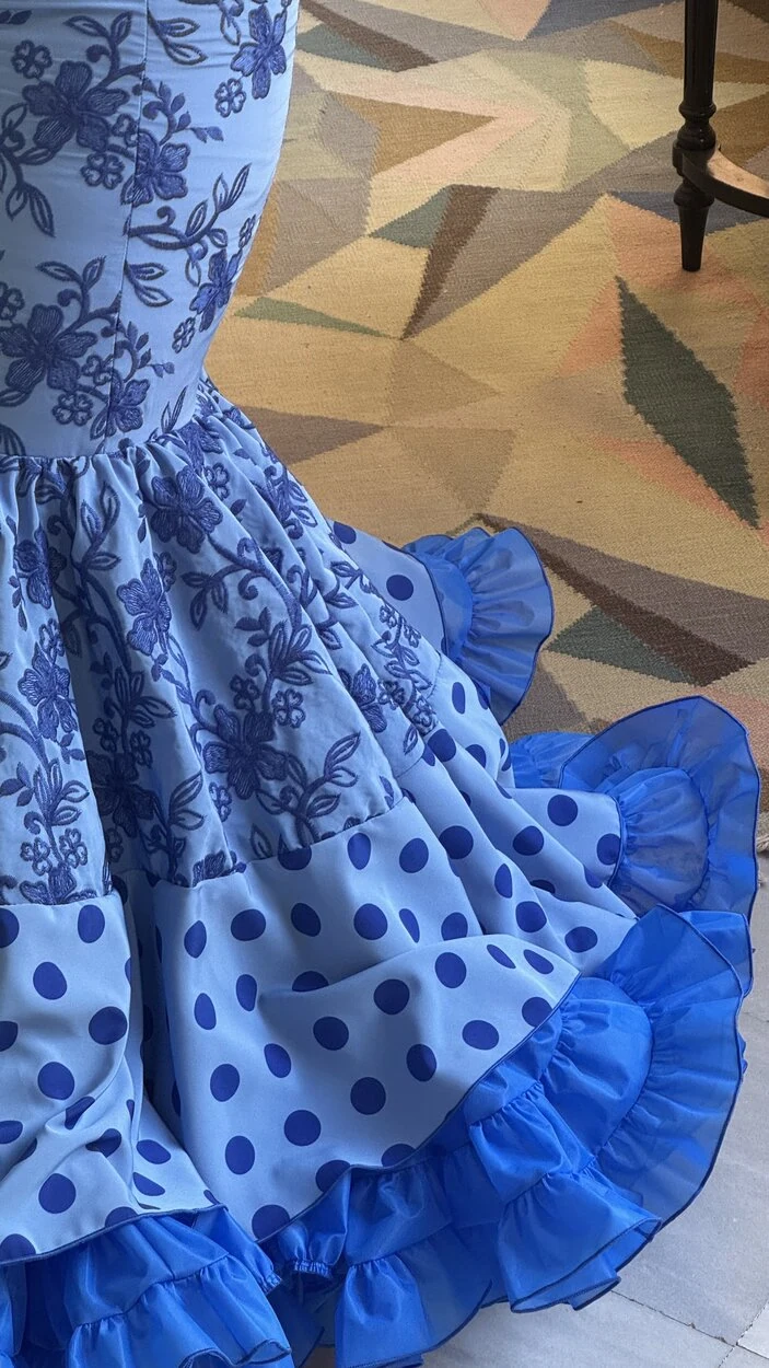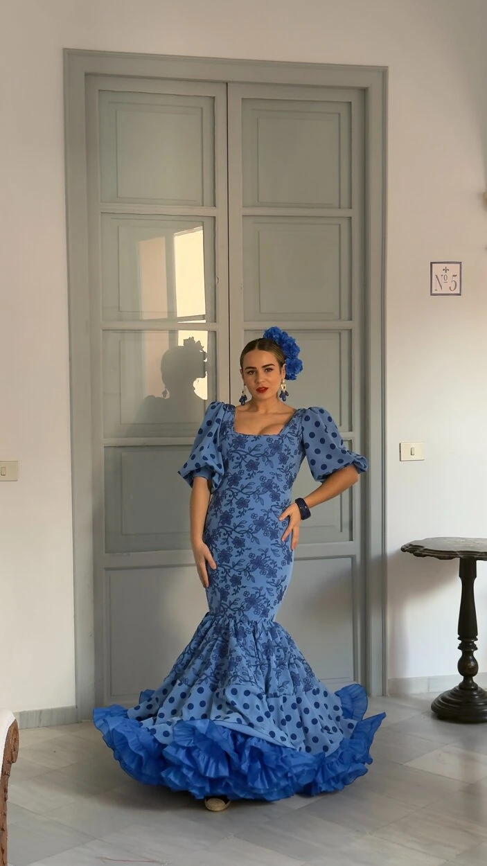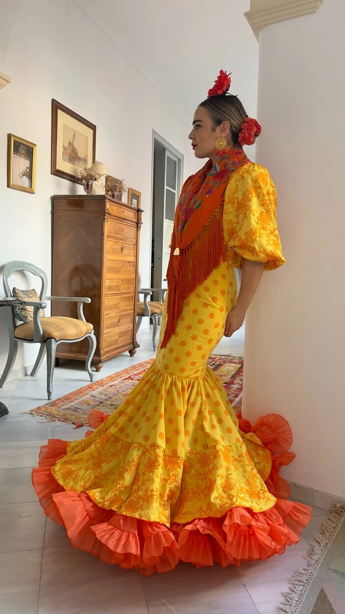 Sus volantes aportan volumen y personalidad al vestido, manteniendo la esencia del traje de flamenca tradicional andaluz, con un diseño actual y funcional.