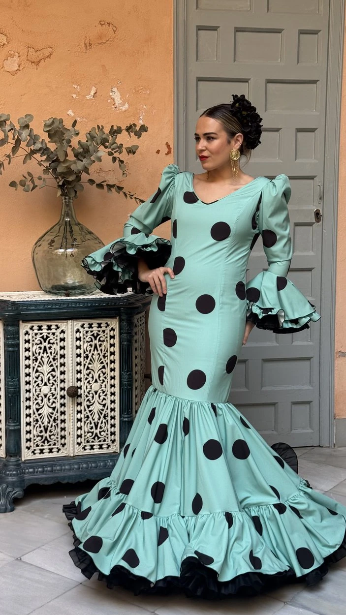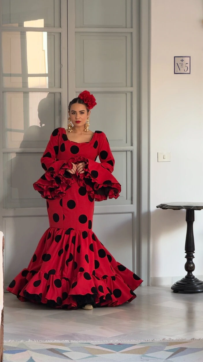 Sus volantes aportan volumen y personalidad al vestido, manteniendo la esencia del traje de flamenca tradicional andaluz, con un diseño actual y funcional.