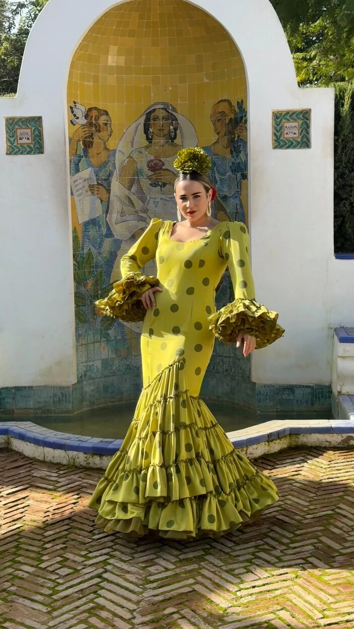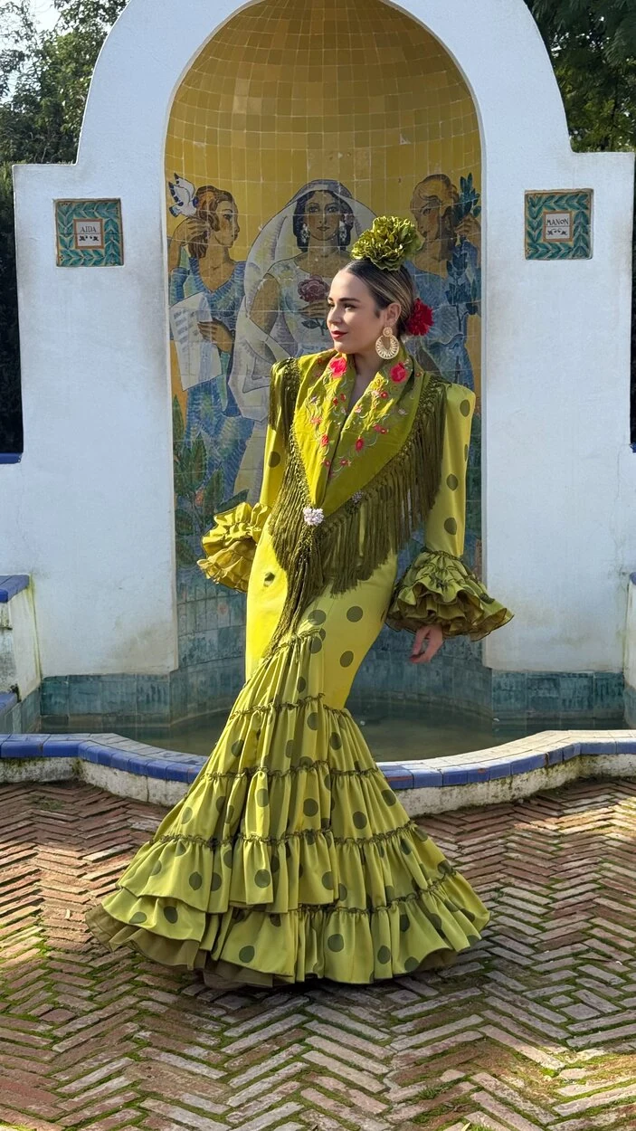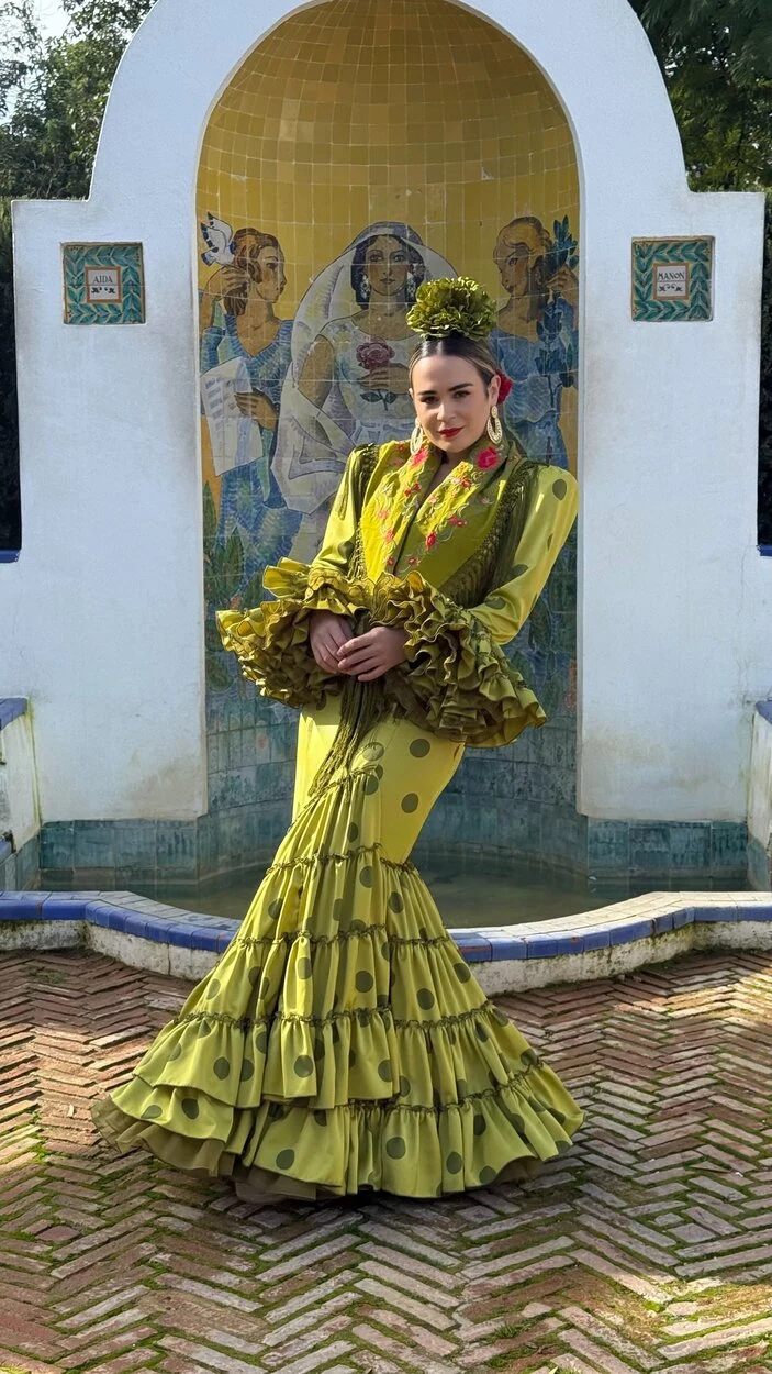 Sus volantes aportan volumen y personalidad al vestido, manteniendo la esencia del traje de flamenca tradicional andaluz, con un diseño actual y funcional.