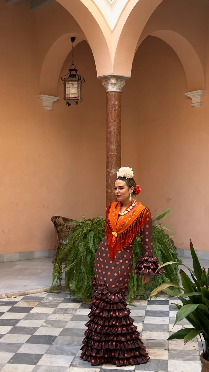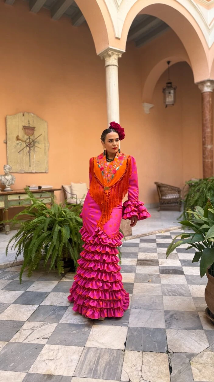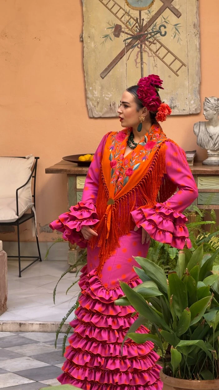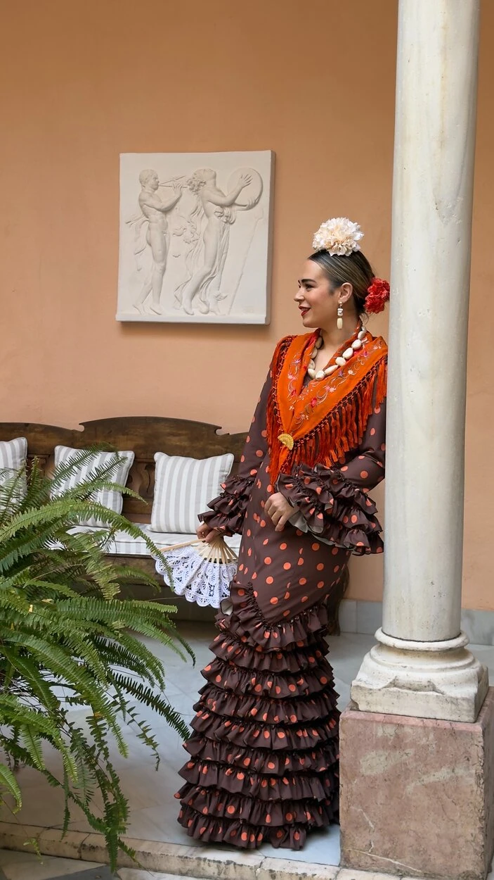 Sus volantes aportan volumen y personalidad al vestido, manteniendo la esencia del traje de flamenca tradicional andaluz, con un diseño actual y funcional.