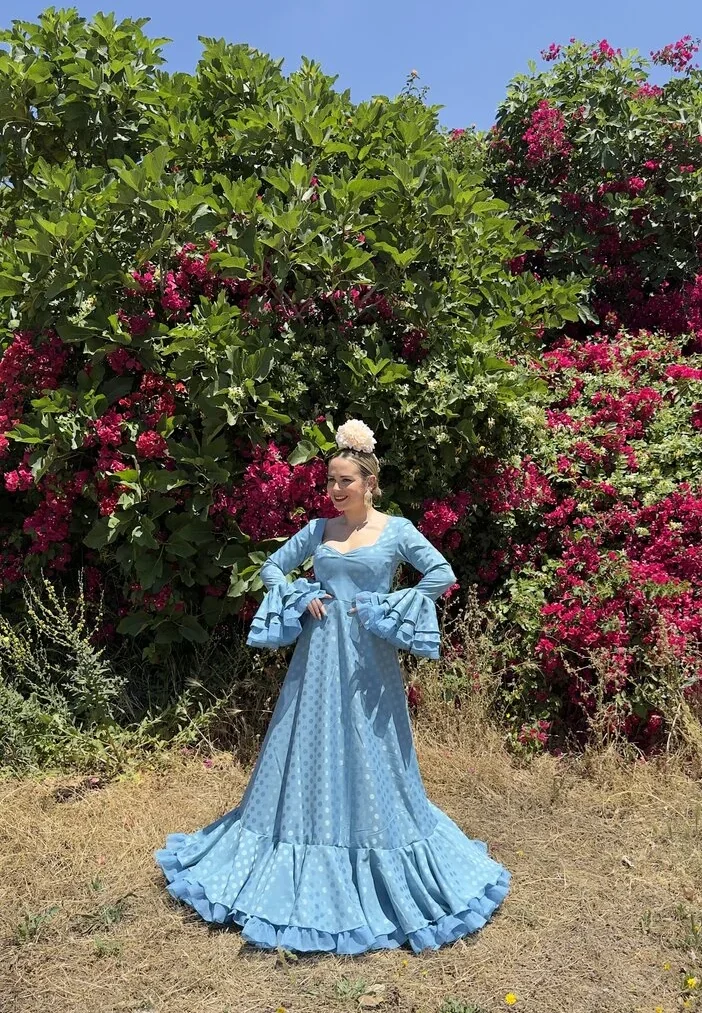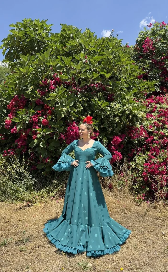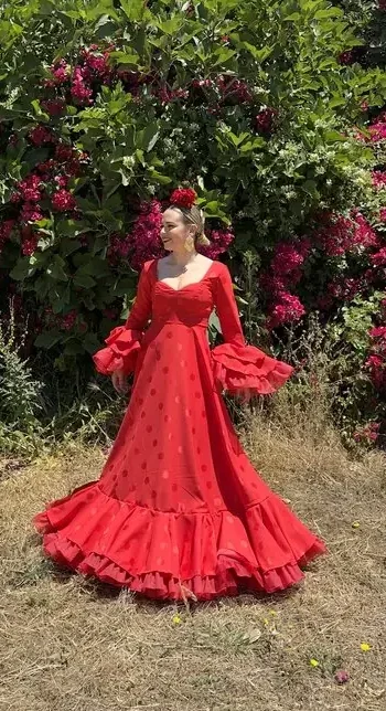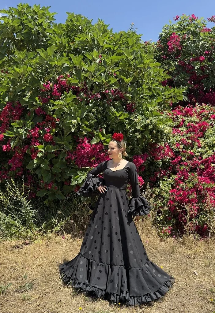 Sus volantes aportan volumen y personalidad al vestido, manteniendo la esencia del traje de flamenca tradicional andaluz, con un diseño actual y funcional.