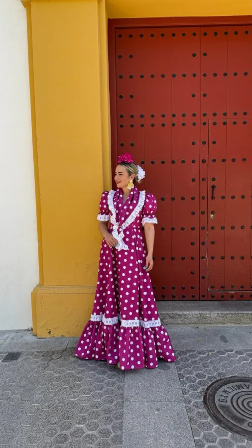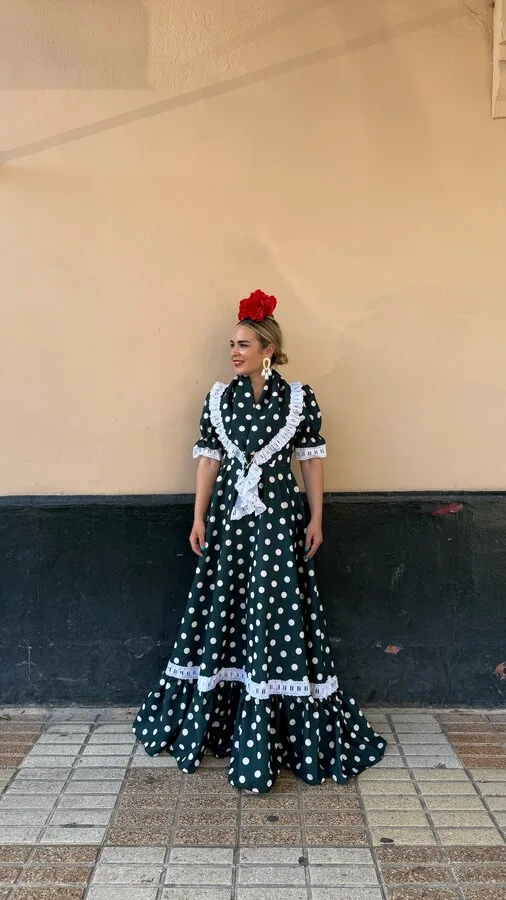 LBF Traje de flamenca Bata farolillo Huelva cinta lunar. Talla 36 a 46