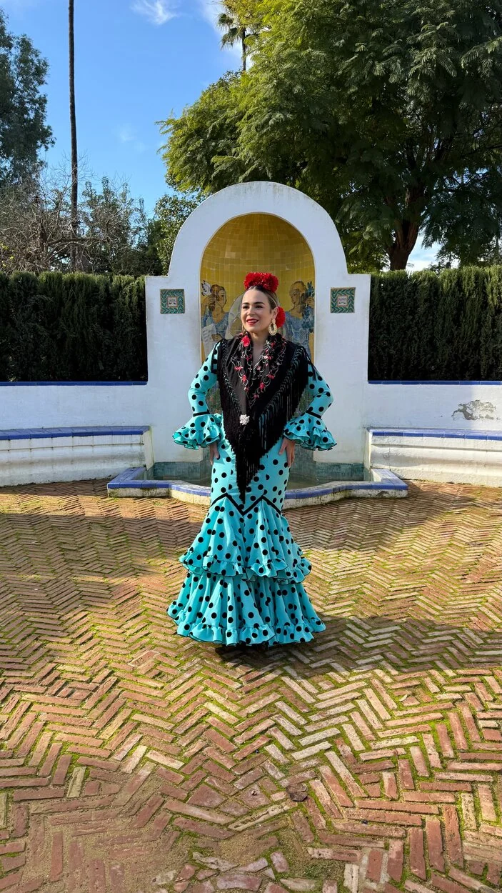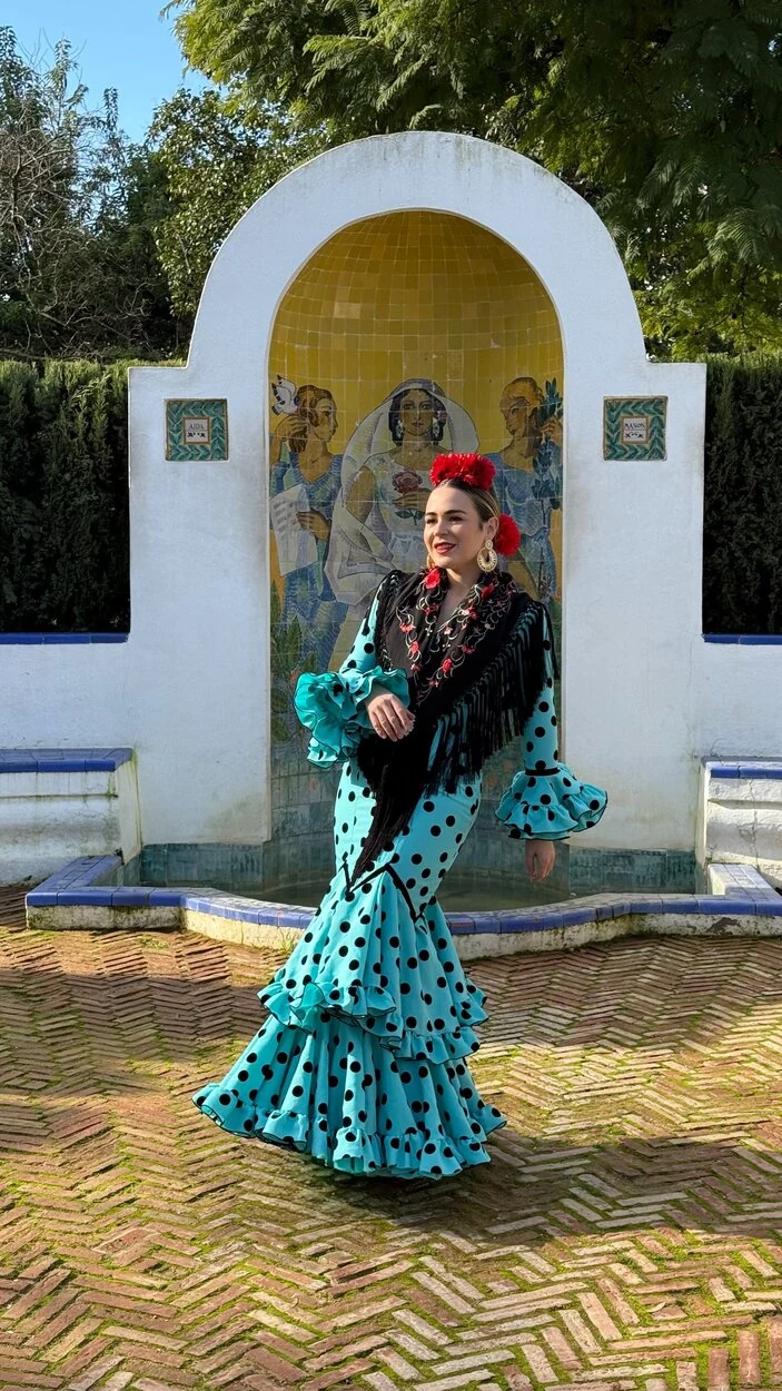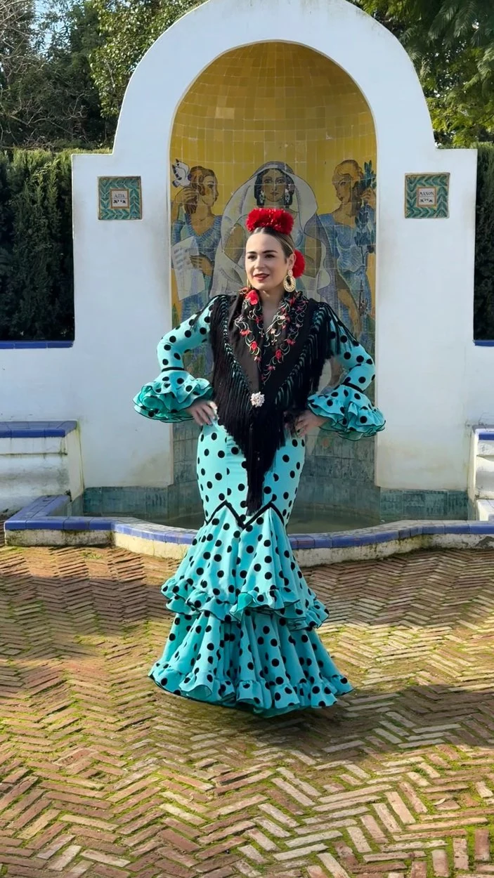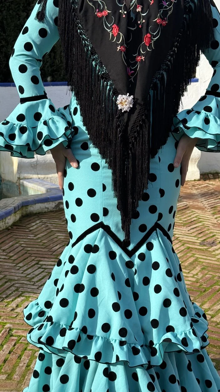 Sus volantes aportan volumen y personalidad al vestido, manteniendo la esencia del traje de flamenca tradicional andaluz, con un diseño actual y funcional.