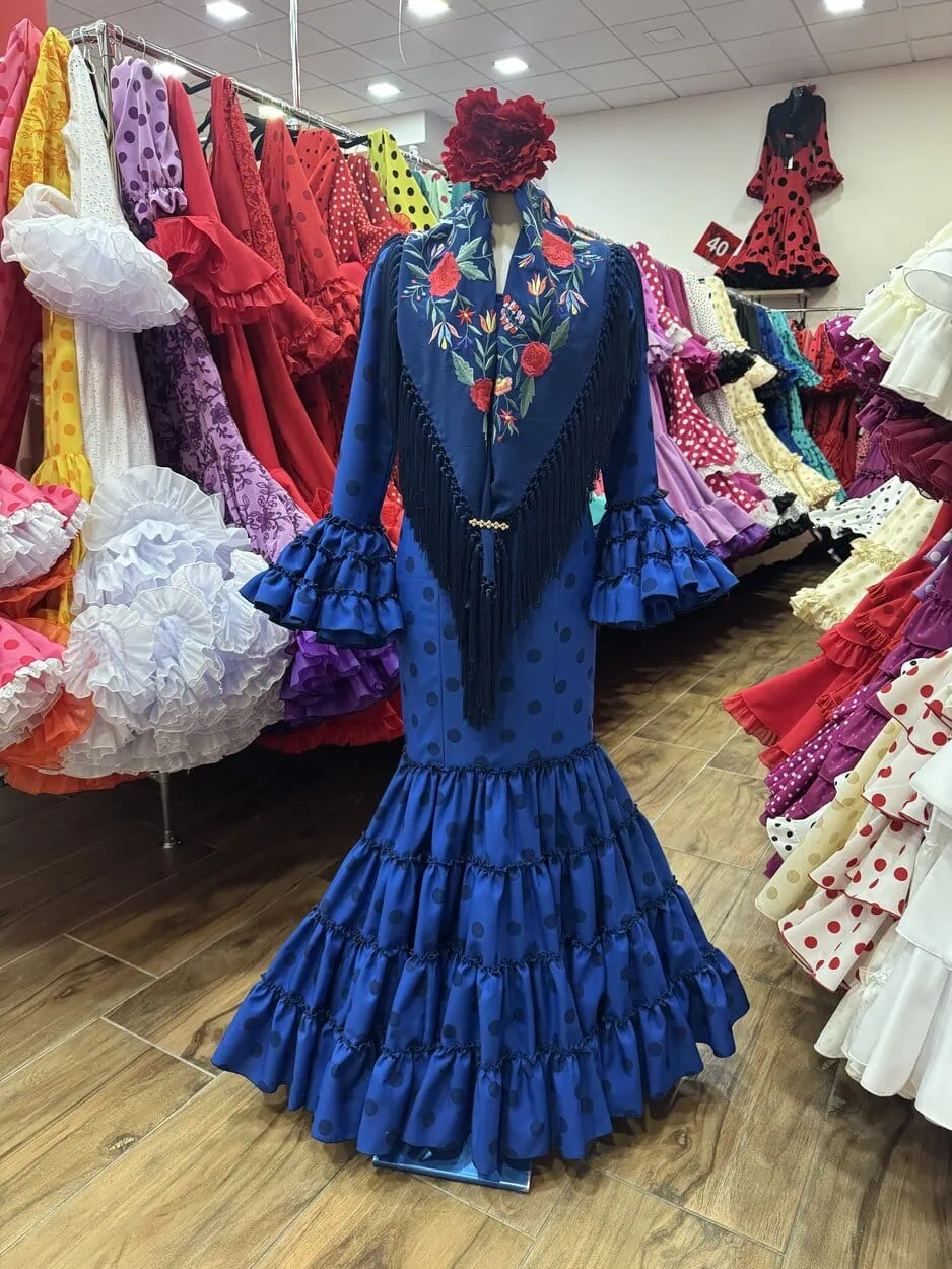 LBF Traje de flamenca Lupita azul añil lunar azul oscuro. Talla 34 a 46