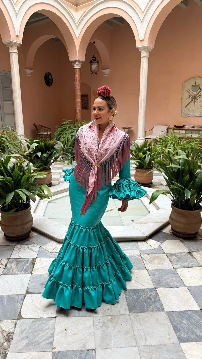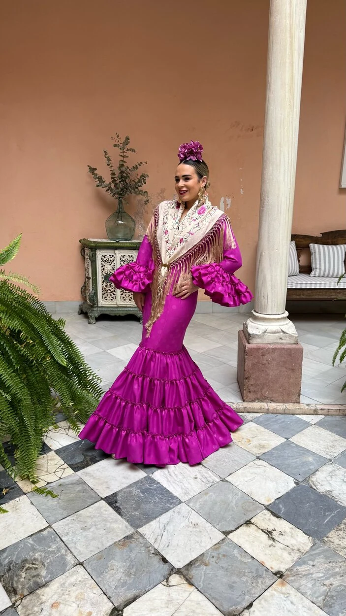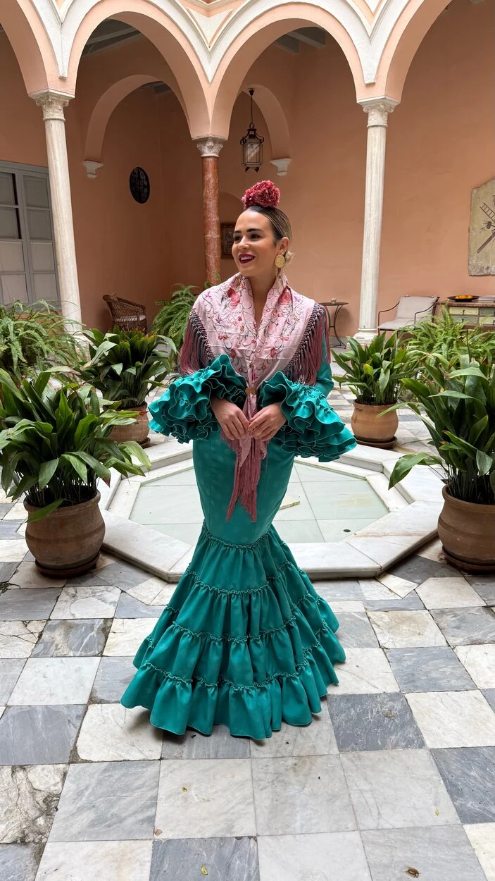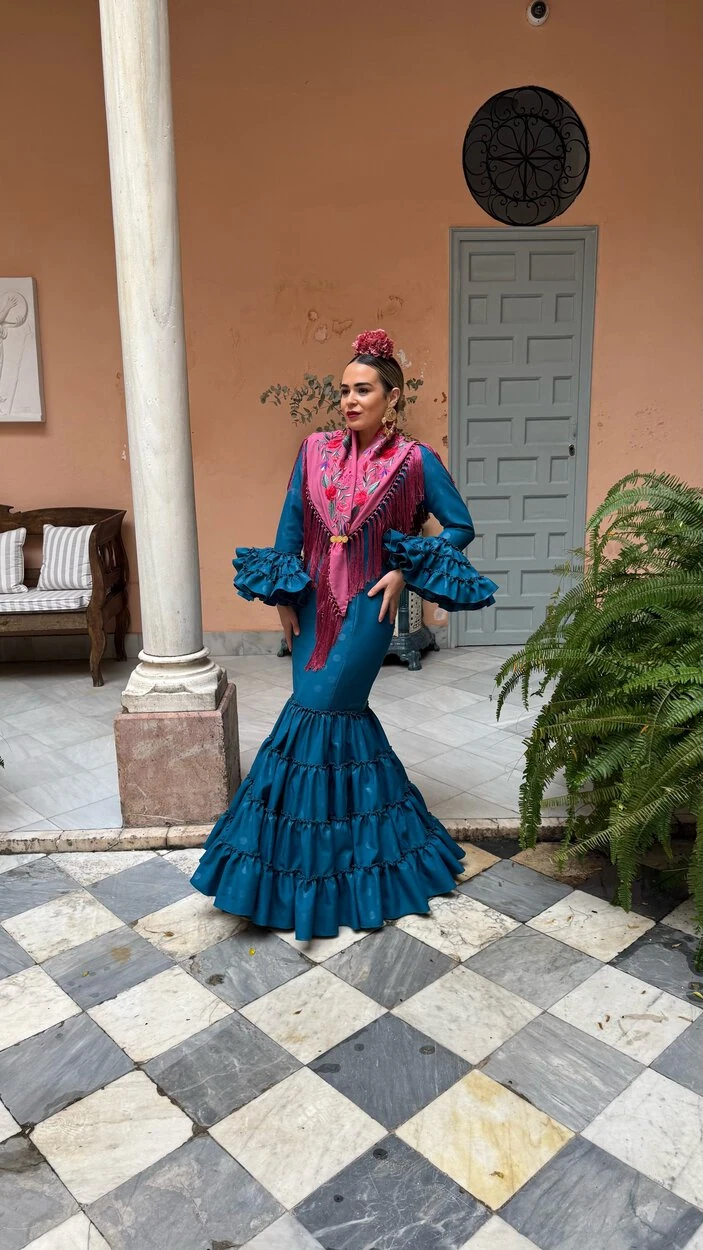Sus volantes aportan volumen y personalidad al vestido, manteniendo la esencia del traje de flamenca tradicional andaluz, con un diseño actual y funcional.