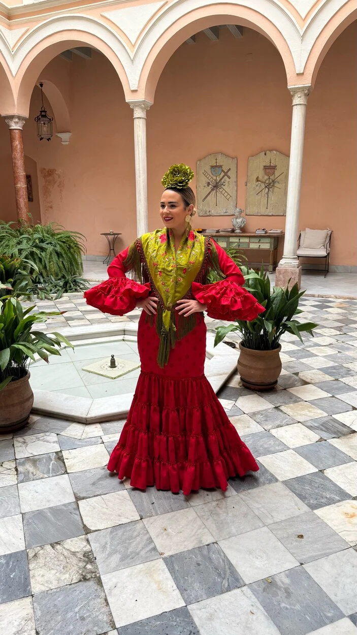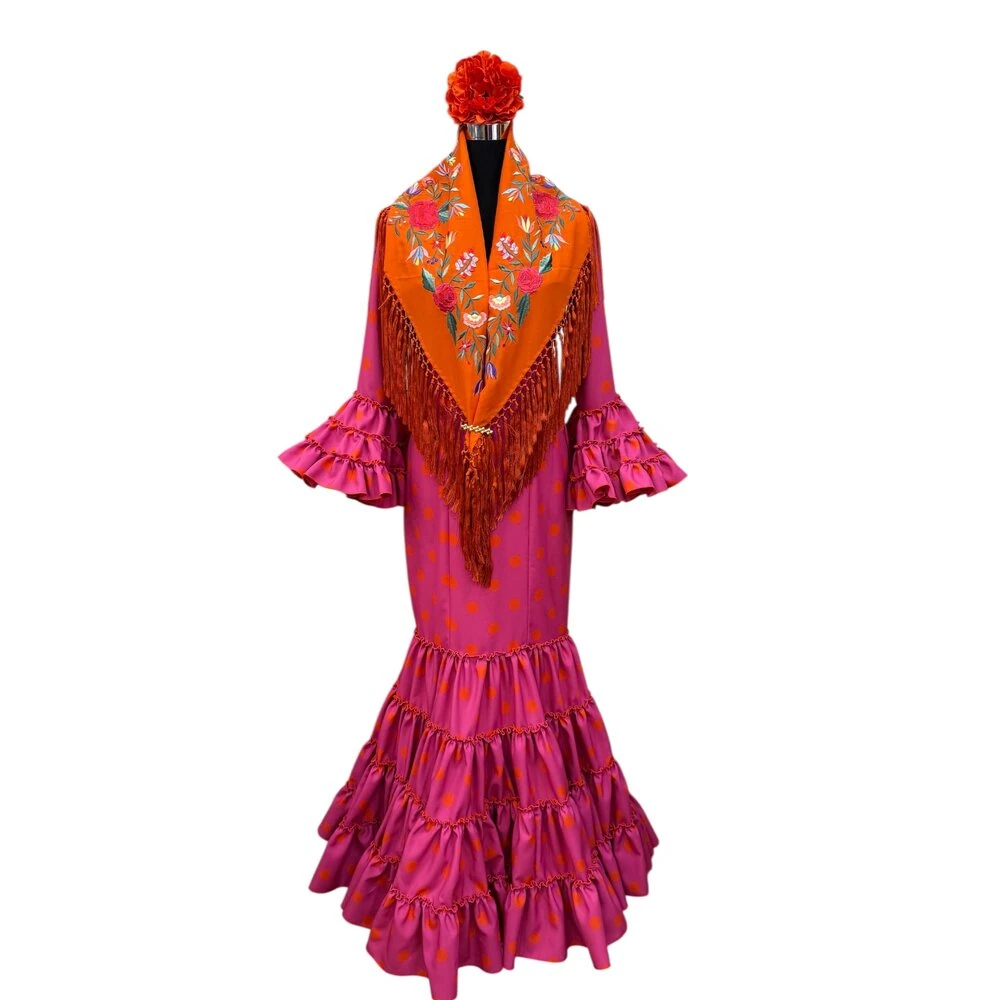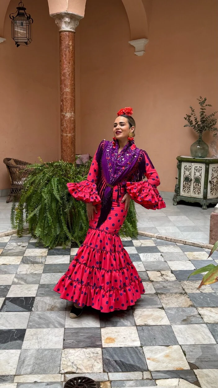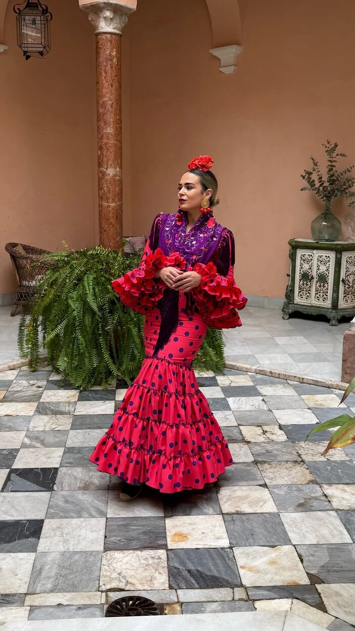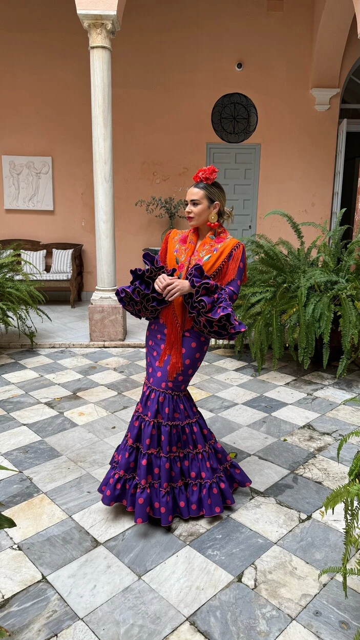 Sus volantes aportan volumen y personalidad al vestido, manteniendo la esencia del traje de flamenca tradicional andaluz, con un diseño actual y funcional.