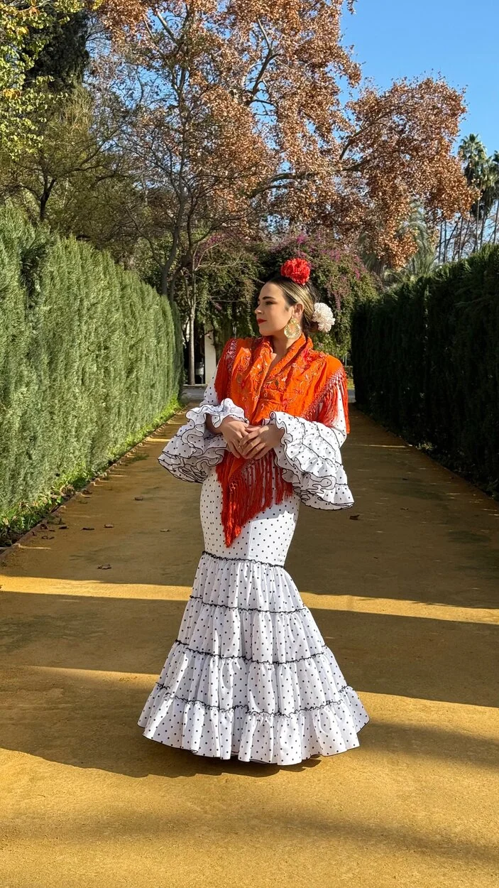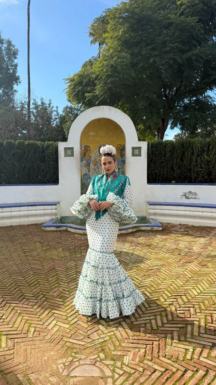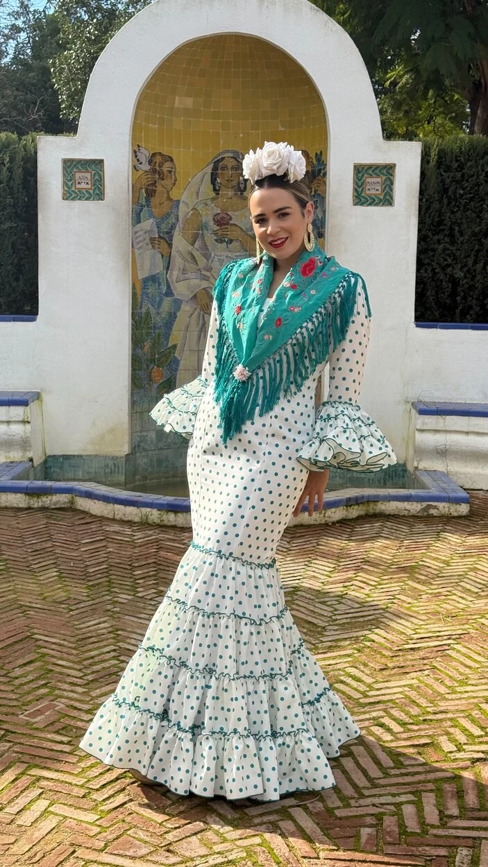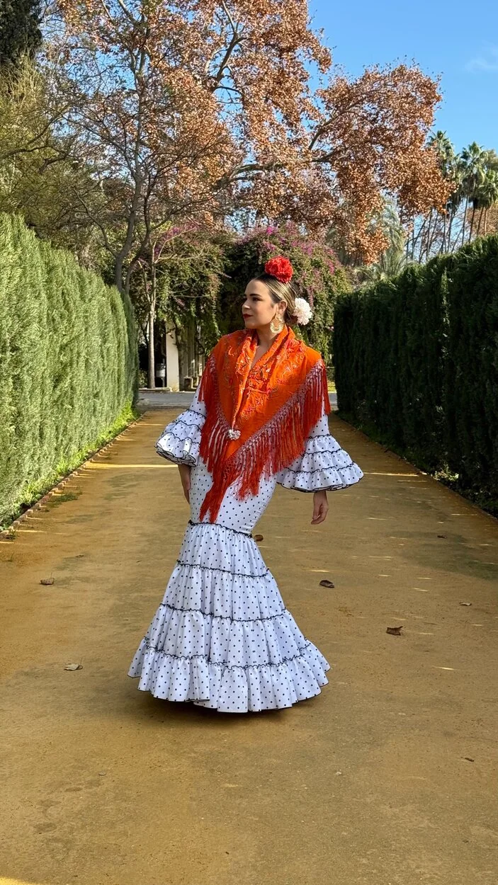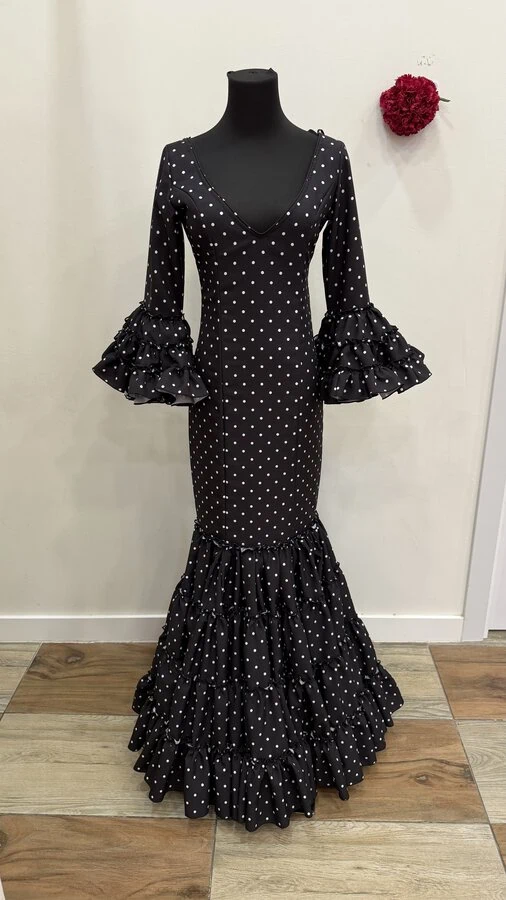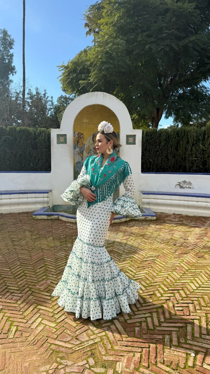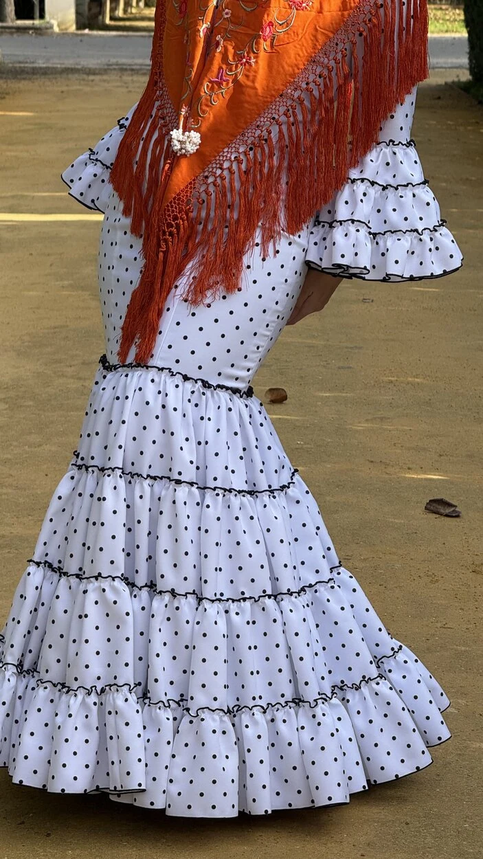 Sus volantes aportan volumen y personalidad al vestido, manteniendo la esencia del traje de flamenca tradicional andaluz, con un diseño actual y funcional.