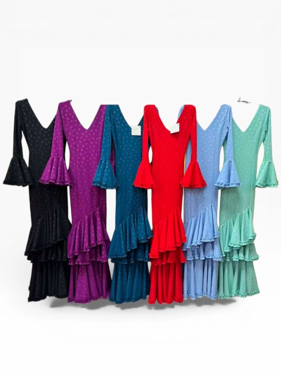 LBF Traje de flamenca lycra tres volantes con subida monocolor. Talla XS a XXL
