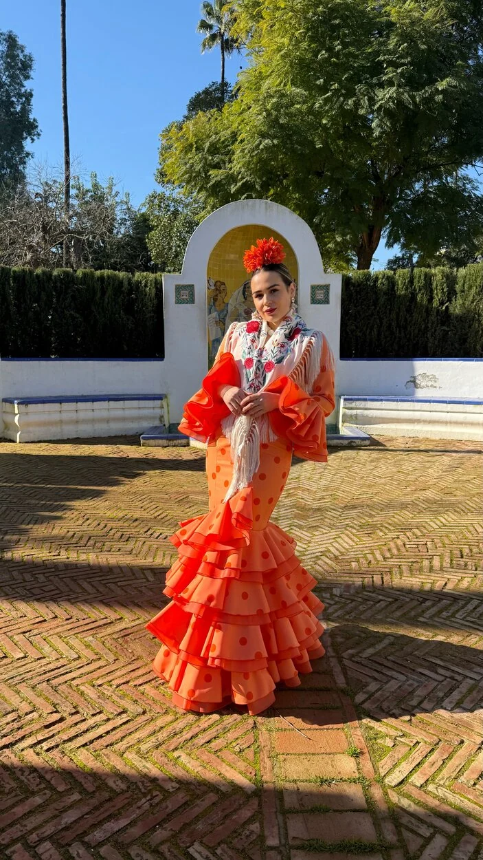 Sus volantes aportan volumen y personalidad al vestido, manteniendo la esencia del traje de flamenca tradicional andaluz, con un diseño actual y funcional.