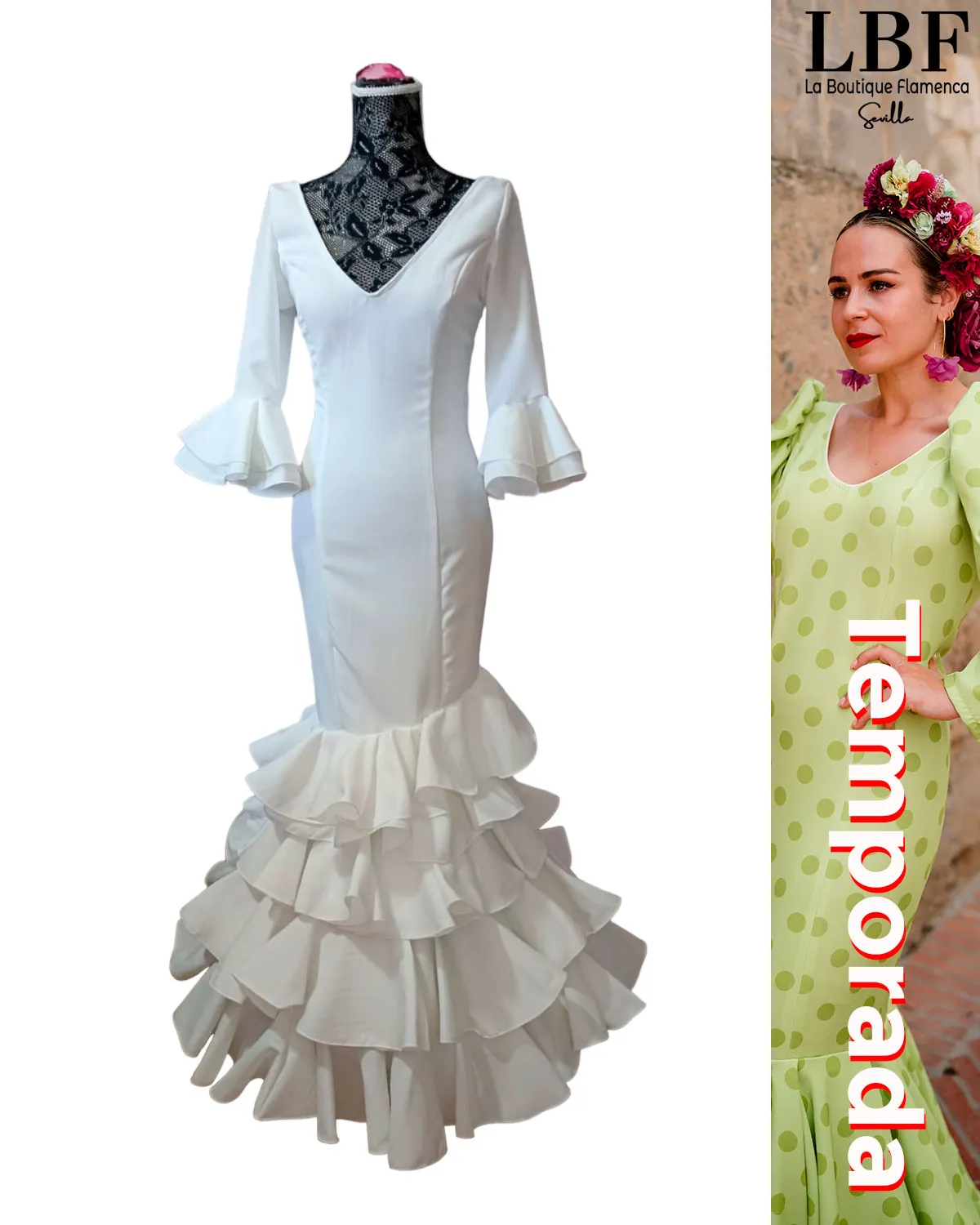 Sus volantes aportan volumen y personalidad al vestido, manteniendo la esencia del traje de flamenca tradicional andaluz, con un diseño actual y funcional.