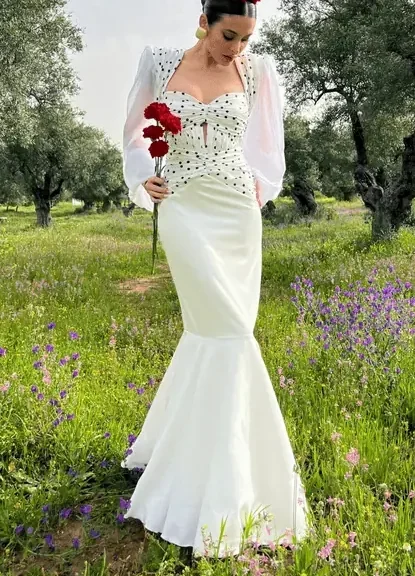 LBF Traje flamenca cascos blanco lunar negro. Talla 38