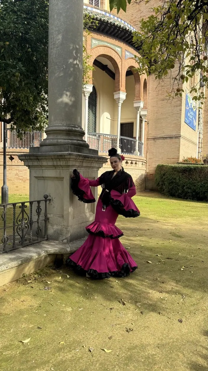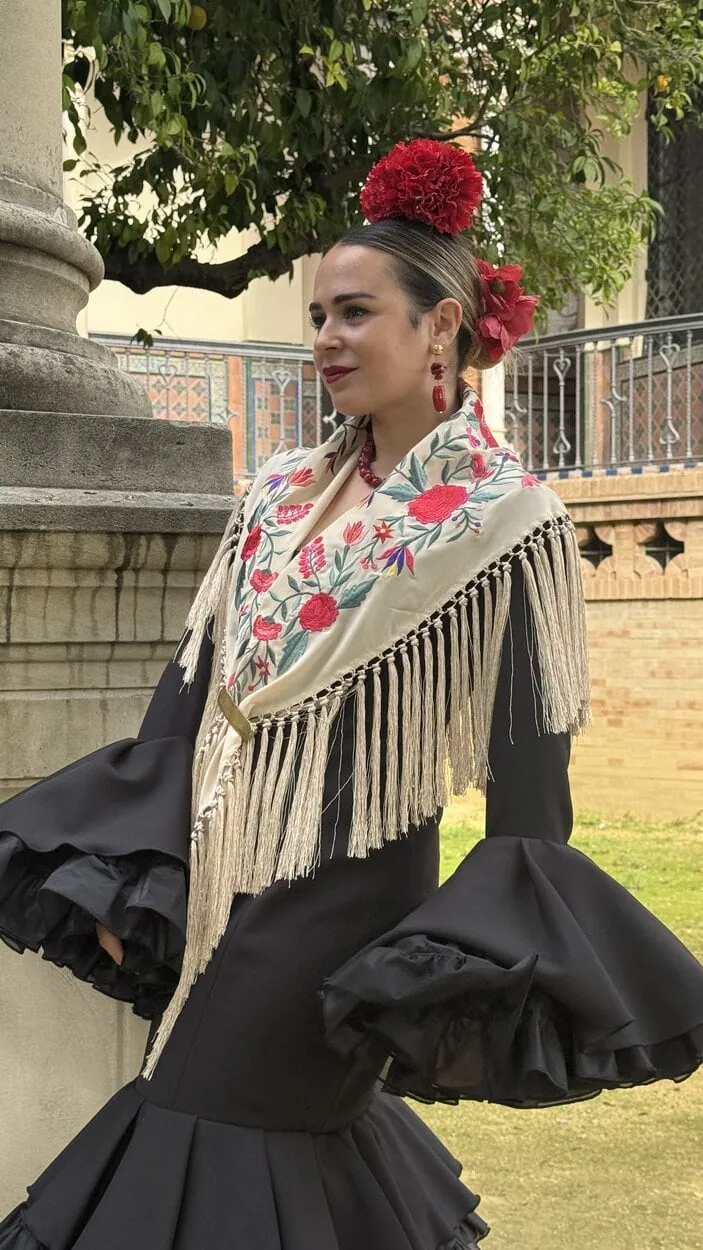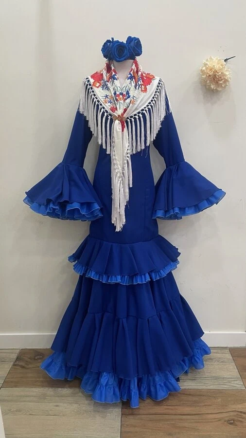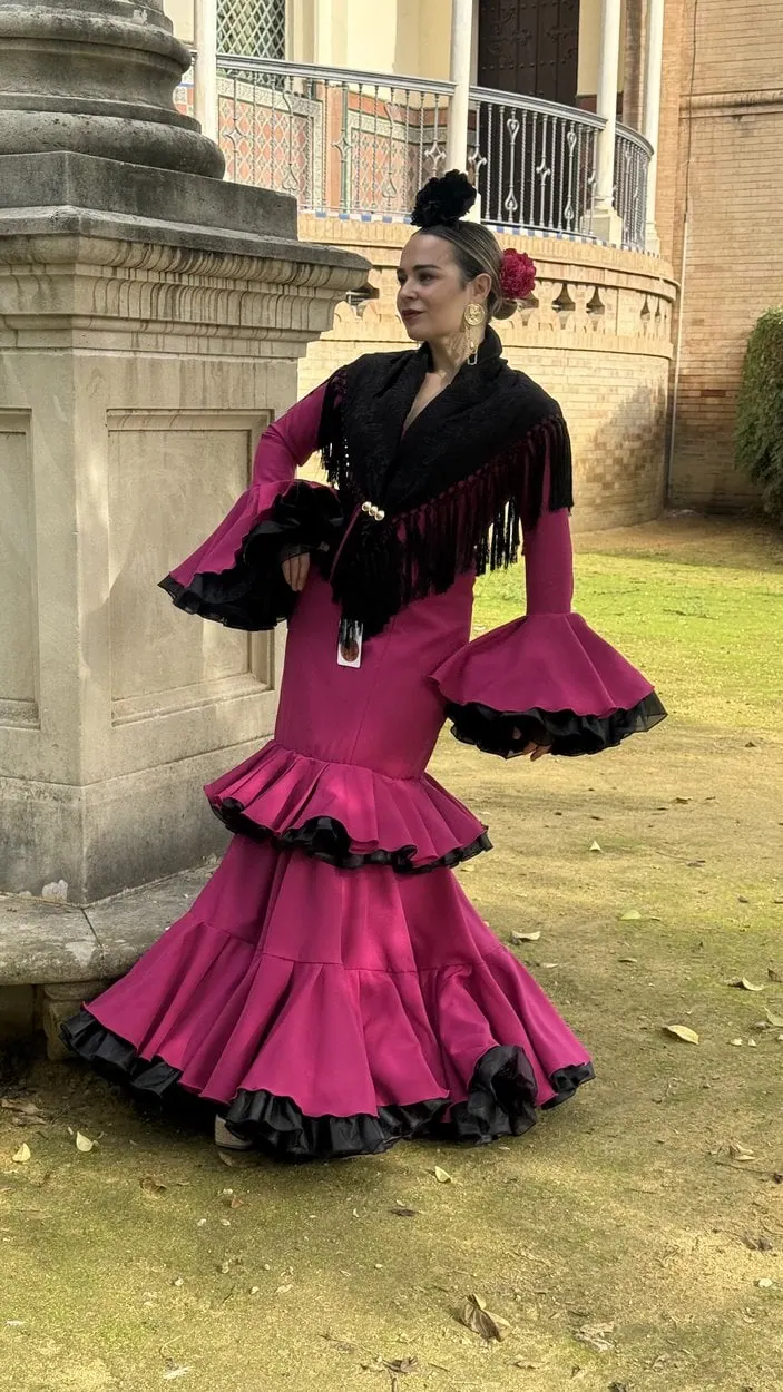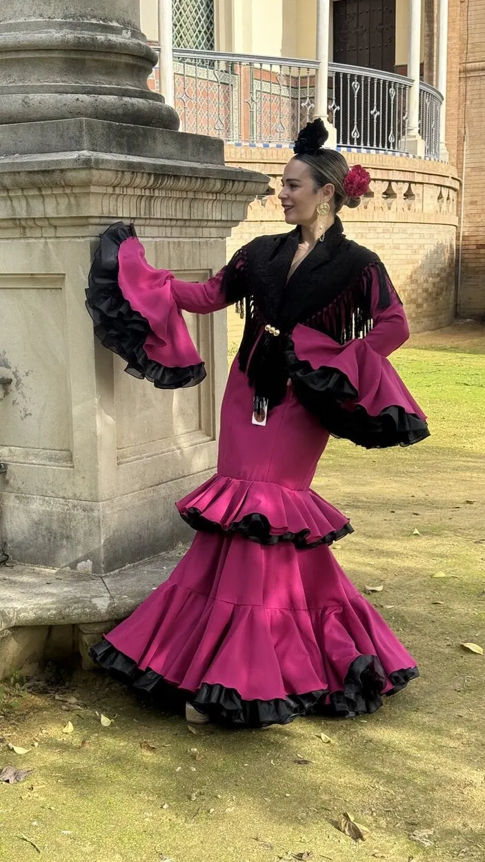 Sus volantes aportan volumen y personalidad al vestido, manteniendo la esencia del traje de flamenca tradicional andaluz, con un diseño actual y funcional.