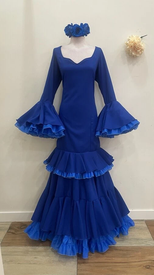 Traje de flamenca fabricado en Sevilla en nuestra fábrica propia, confeccionado con tejidos nacionales de alta calidad. Diseño cómodo y favorecedor, ideal para feria, romería y eventos flamencos. Producción durante todo el año para garantizar disponibilidad y el mejor precio.